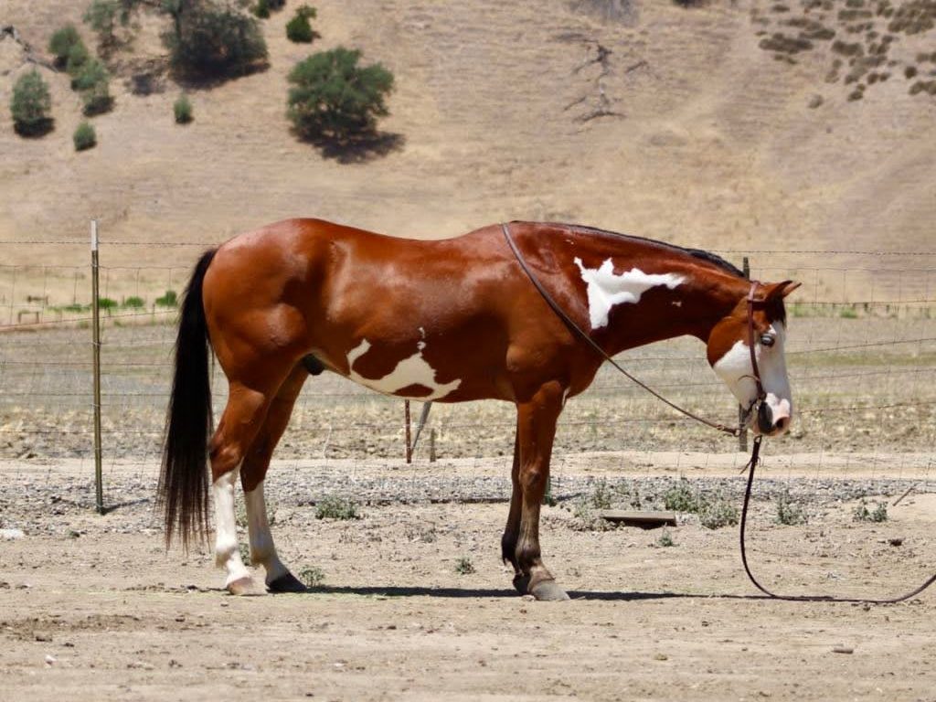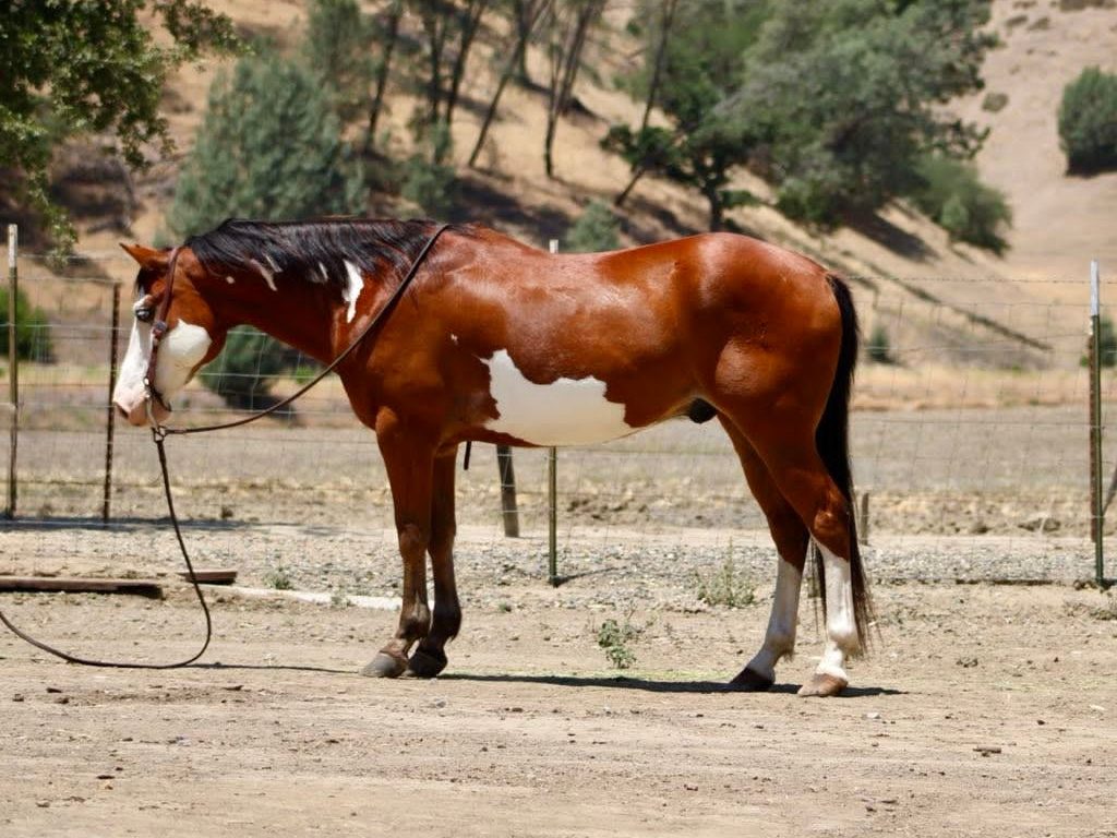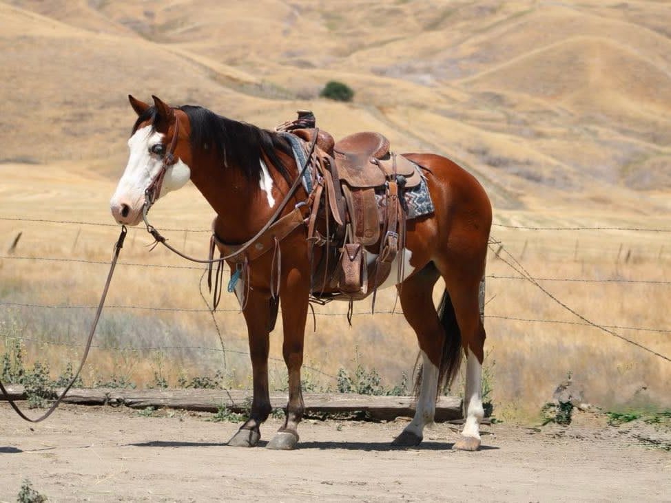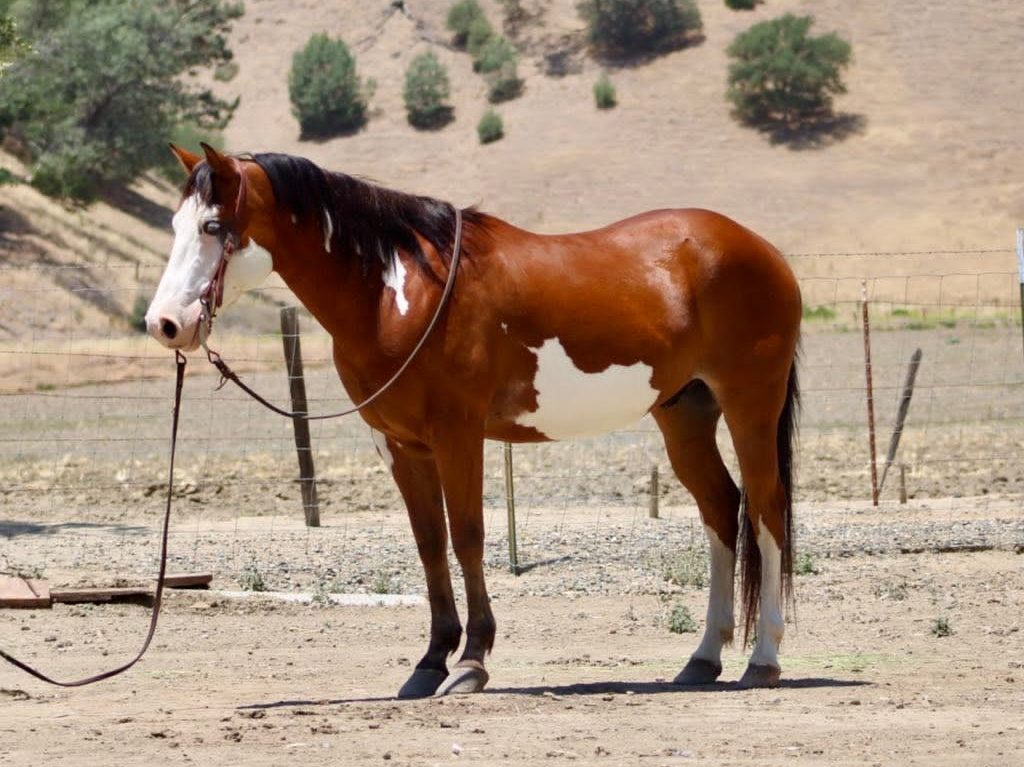Bako the charming bay over paint gelding who’s as handsome as he is capable! Standing at a perfect 14.2 hands, striking blue eyes and sweet demeanor make him an absolute head-turner. Bako is a reliable and willing partner under saddle. He is a naturally cautious and friendly horse, making him a joy to ride for any level of rider. He picks up his leads with ease, has a nice, soft stop, and backs up smoothly. Bako’s background as a ranch horse shines through in his versatility. He’s been used extensively for gathering, sorting, and branding cattle, proving his dependability in demanding situations. He’s also a natural in the hills, confidently navigating all types of terrain, from narrow trails to crossing logs and water.Bako is easy to handle. He ties and bathes well, is easy to saddle, and has experience in both stall and pasture settings. If you’re searching for a no-nonsense horse that you can count on day in and day out,Bako is your guy! He’s is ready to find his forever home.
